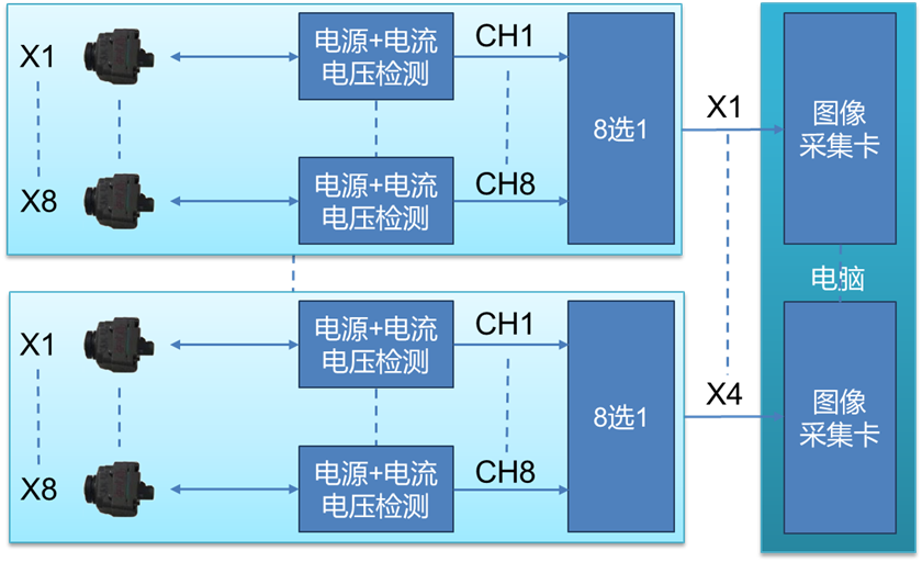 每张采集卡可以通过多路选择器连接8个摄像头分复用一张采集卡;